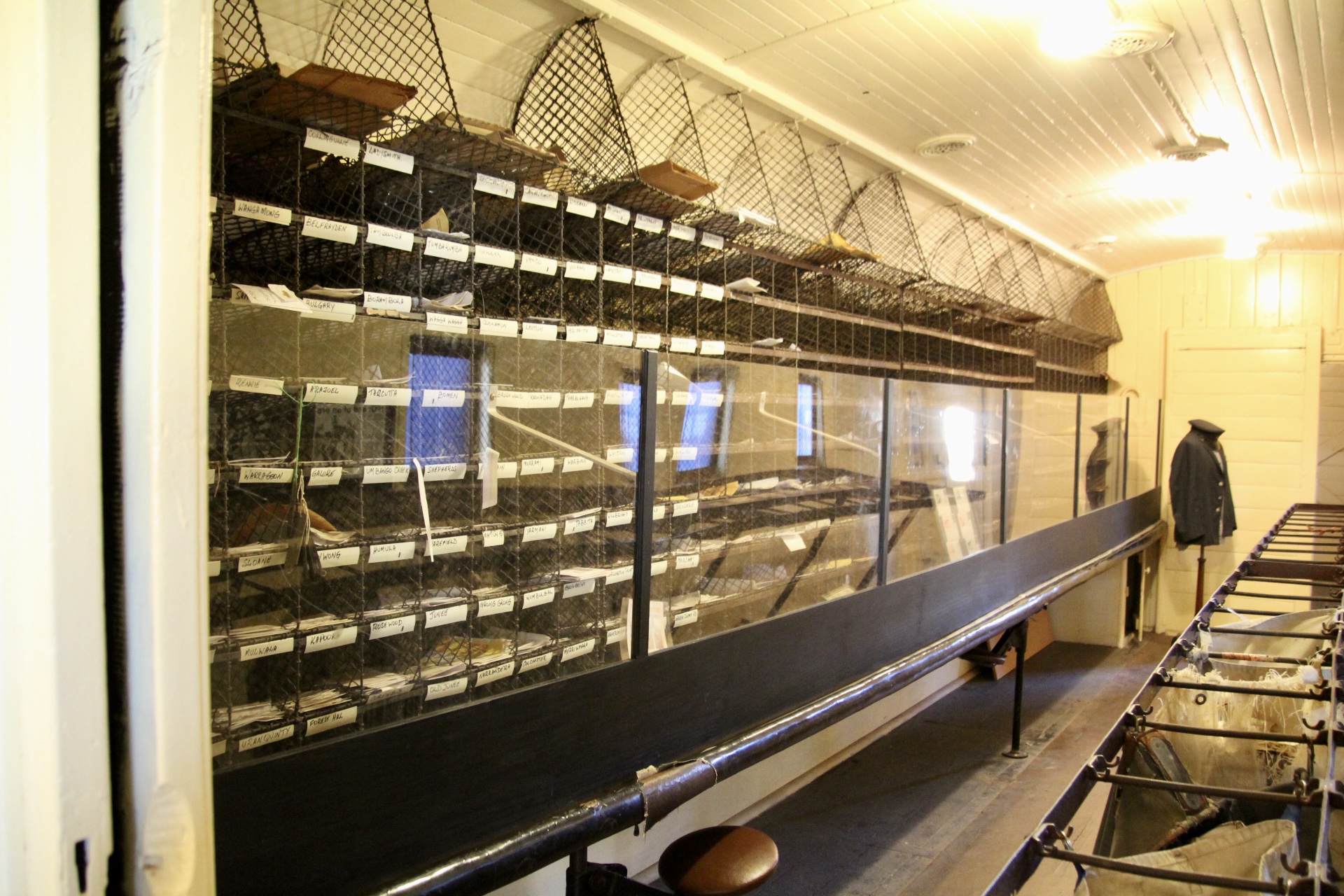 The Mail Car carriage was used to sort the mail whilst the train was in transit. There were separate racks for each town that the train passed through, and shelves were available for parcels. Larger items were stored at the end of the van. One can only imagine the degree of balance and accuracy required to sort mail whilst rocketing along the railway line at speed! Other carriages included the Junee Accident Van. This was part of a response unit that could be sent all over the state if there was a serious accident or derailment to offer medical support. The guide said it was like a triage service, stitching people up as best as possible in the circumstances.