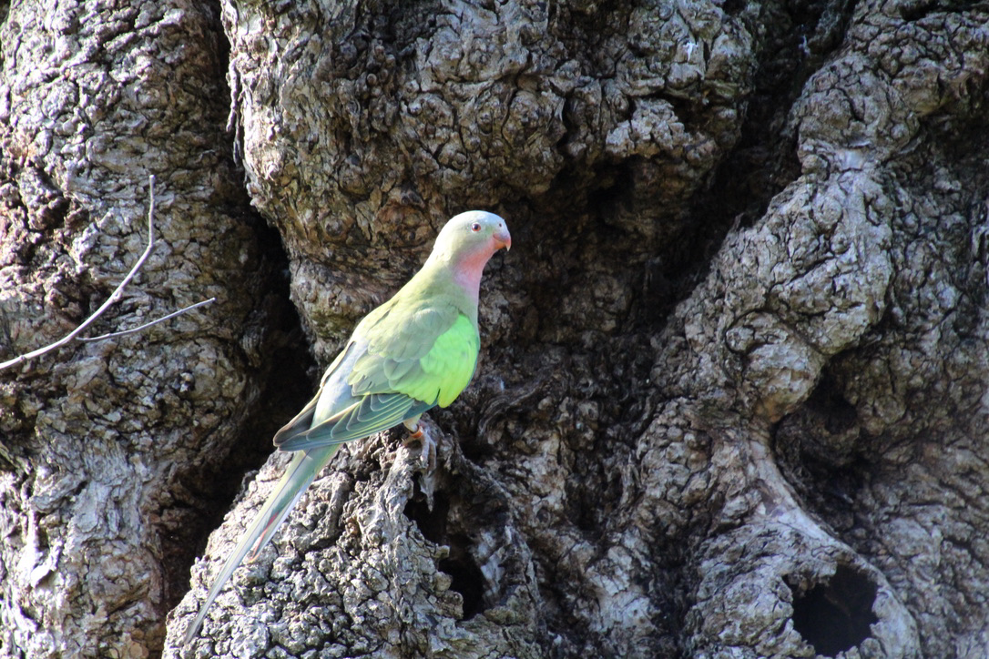 A more subtle colouring can be found on the Princess Parrot (Polytelis anthopeplus), described as an elegant but elusive nomad of the west and central desert areas of Western Australia and the Northern Territory. The Great Sandy Desert is the main distribution area, but there have been sightings across much of the arid areas of the country. Young birds have a pale olive head; this develops into a lilac-blue crown, contrasted by a pink throat.