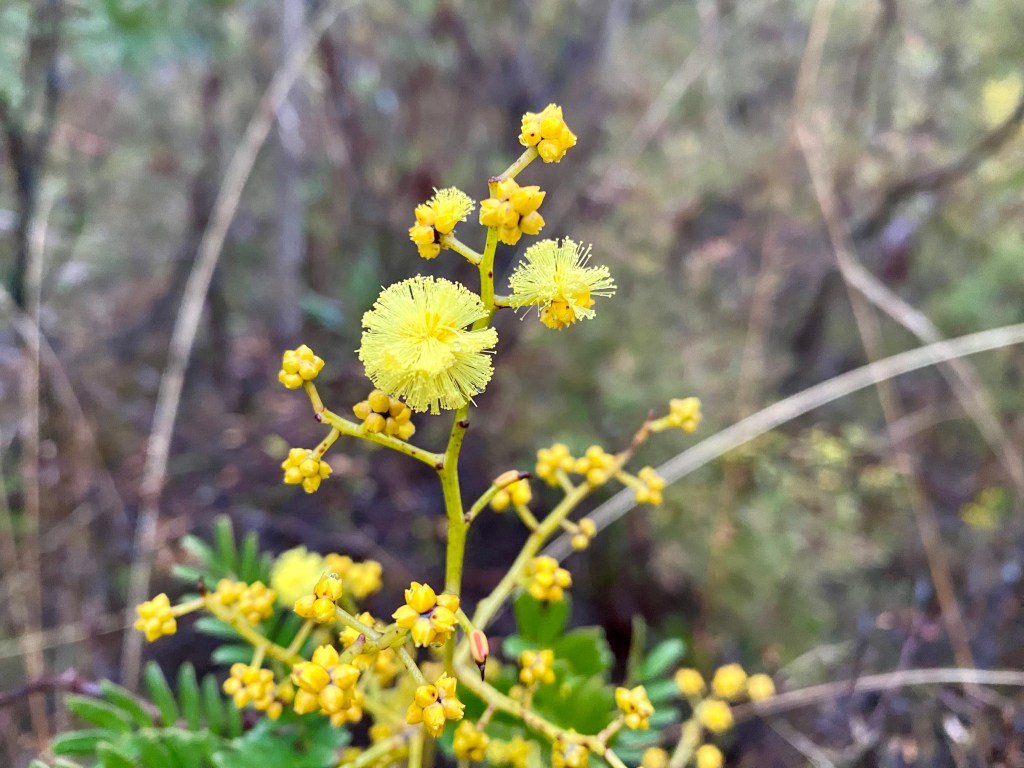 This haiku reminded me of the joy of seeing wattle in bloom. It is the middle of winter here in the mountains, with most exotic trees pared back to bare limbs and native trees providing a khaki-toned backdrop. On dull days in particular, the bonny bright blooms of wattles are enough to lift one’s spirits, drawing the eye, and there are many varieties to be spotted in gardens and nearby bushland.