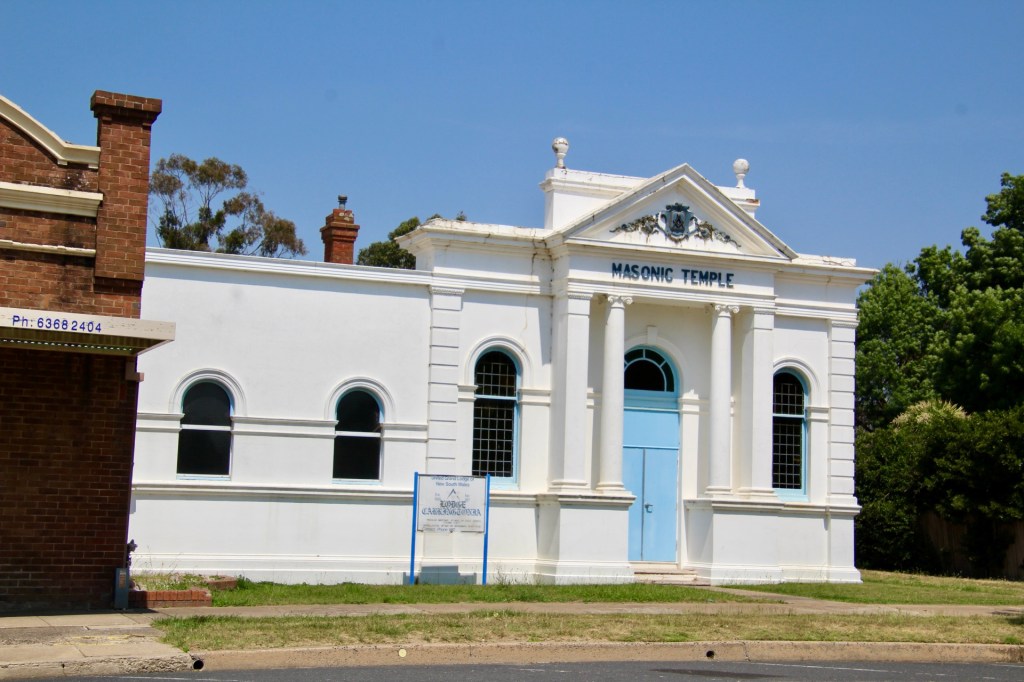 Many of the historic buildings in the town date from the 1870s onwards. The first Court of Petty Sessions was held in Blayney in 1877, and the court house was built in 1880. The post office was opened in 1882 and included a postmaster’s residence. The first meeting of the Masonic Lodge was in 1889, and the Masonic Temple below was constructed in 1910.