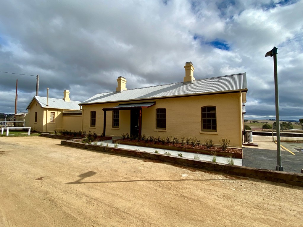 The importance of the coming of the railways is a common theme in the history of the development of country towns. For Gunning, it was late 1875 when the railway line from Goulburn to Yass arrived. The travel time from Sydney in the late 1800s was about 8 hours. The station buildings followed in time, with construction taking place over the following decades. Similar to the railway station buildings at Blayney, there are plans to redevelop the site as a community hub. The interior of the station buildings had not been used for about 30 years, and the restoration project used period features from the original 1875 plans. Station gardens include timbers recovered from the Sydney Harbour Bridge railway tracks.