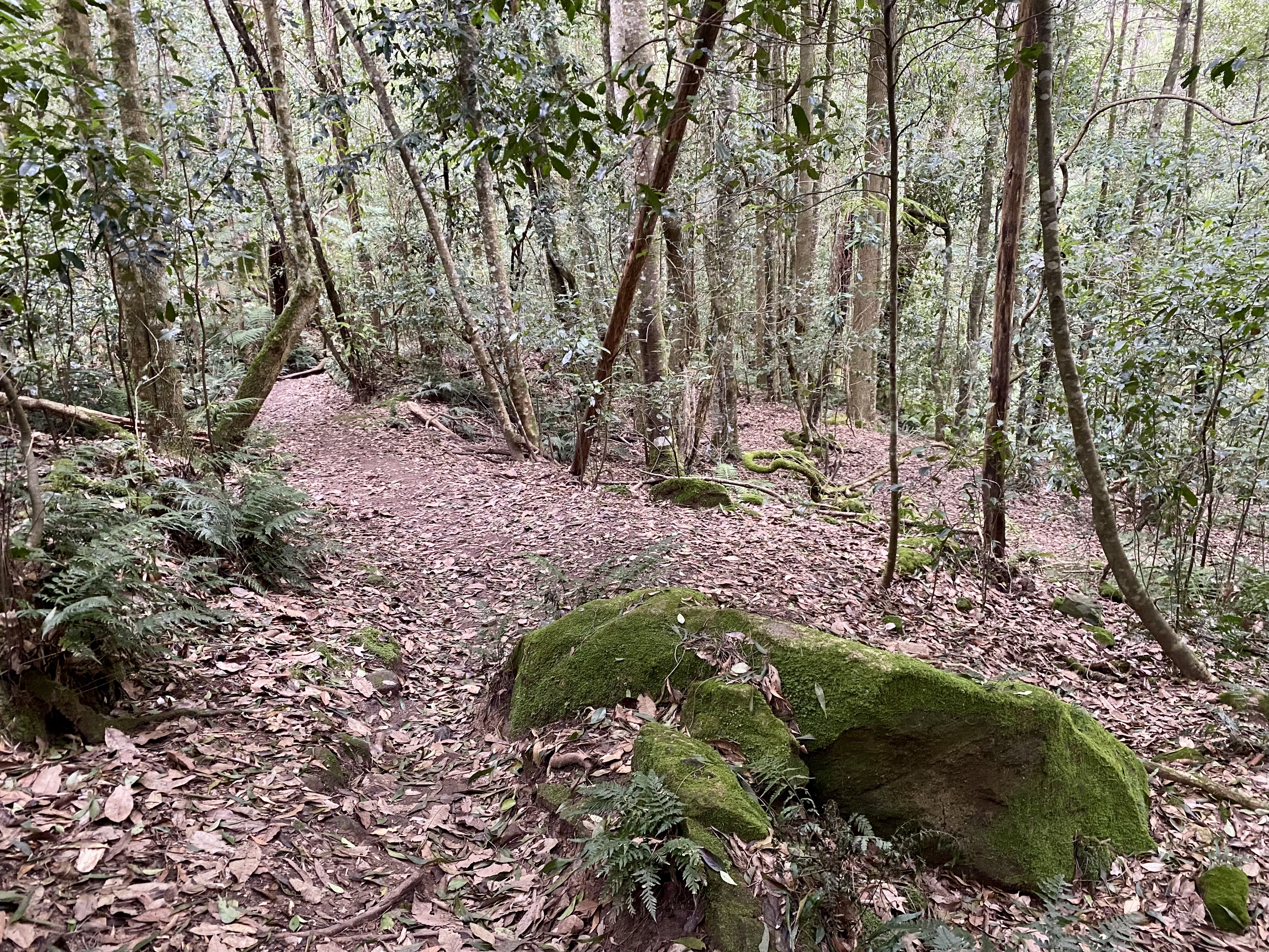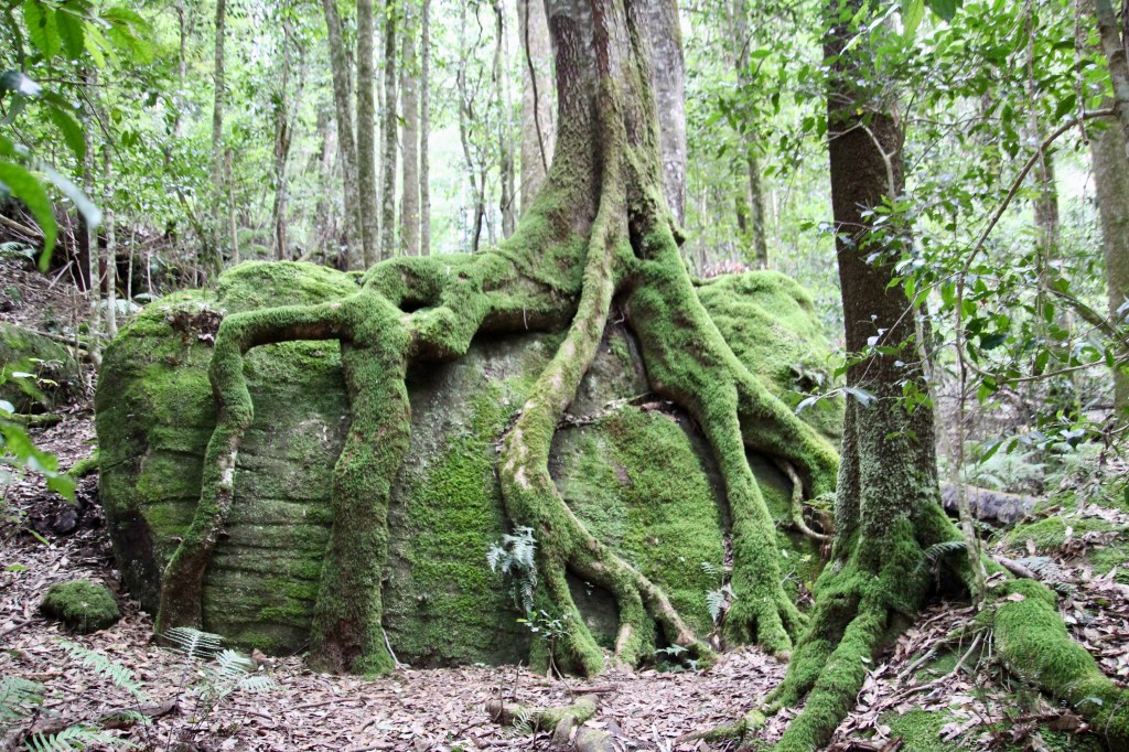 A 600-metre loop walk is set in the rainforest, with the Pulpit Hill Creek crossed twice by the track. There is greenery everywhere, with moss covered rocks and thick vines wound around branches. The trail goes up and down, and there are some steep steps in places. Due to the high moisture level, some surfaces can become slippery.