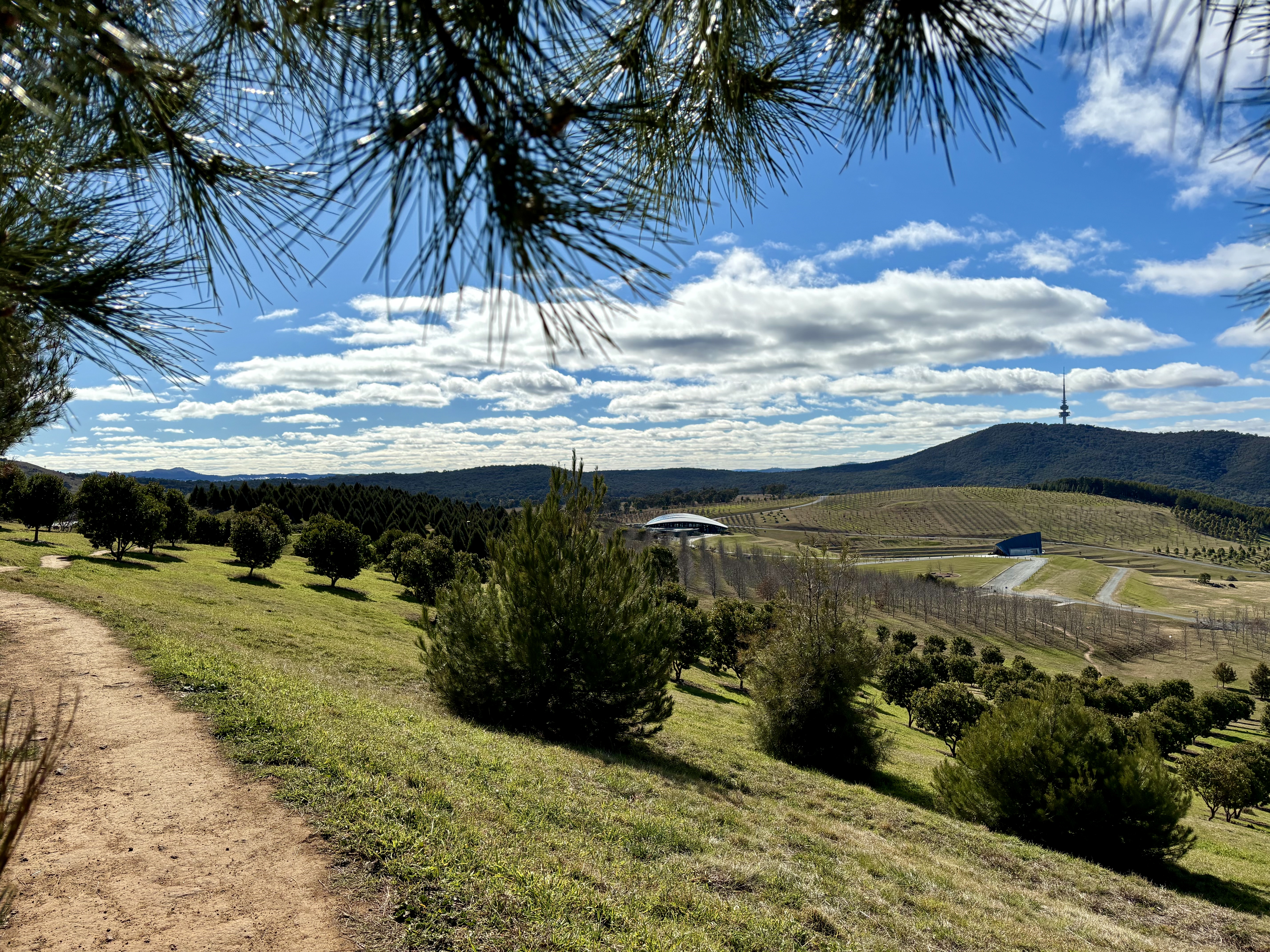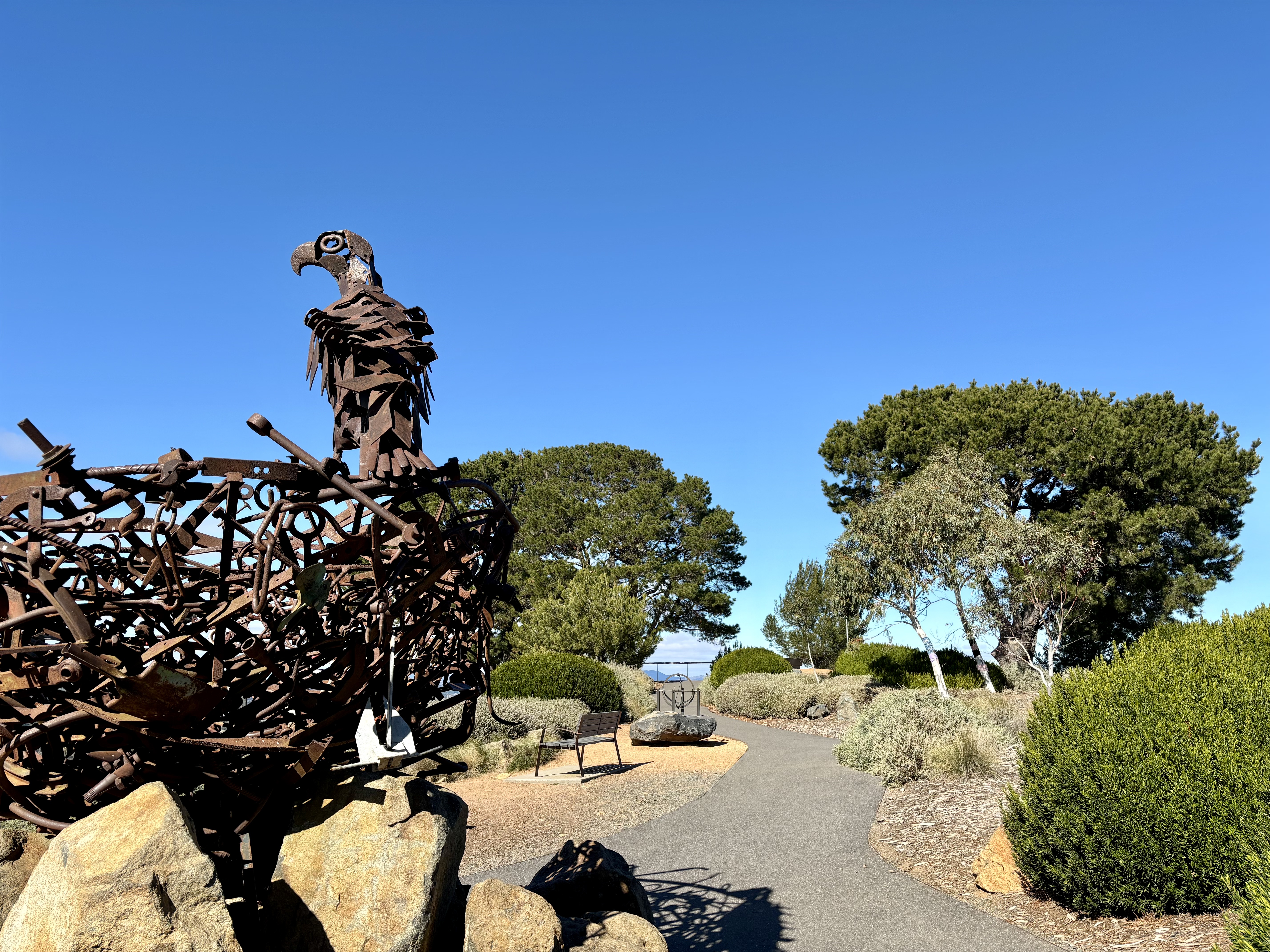 On the day I went for a wander, there were groups of school children enjoying the space and gardens, and a couple of artists were taking advantage of fine weather to capture the stunning views towards Canberra. One of the highlights was coming across sculptures in the arboretum, including Nest III, shown above. This was created by Richard Moffat in 2007, and is an Australian wedge-tailed eagle on its nest. The sculpture is made from welded steel found-objects, mainly abandoned farm machinery, and it sits atop Dairy Farmers Hill. The sculpture at the top of the page was created by Marcus Tatton and Chris Viney, and is based on three words from ‘My Country’. This is a well-known poem by Australian poet and fiction writer Dorothea Mackellar. It is in the form and style of Mackellar’s handwriting, and is visible from many parts of the arboretum: it is 35 metres long and 3 metres high. You can find more information about the Forest Sculpture Gallery here.