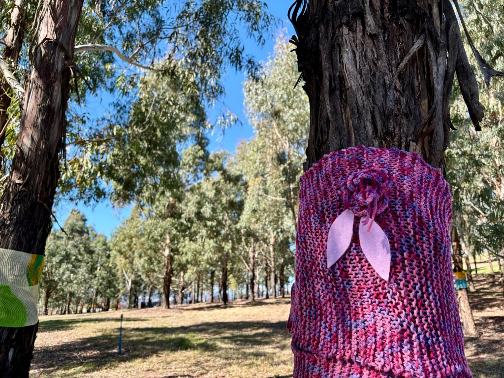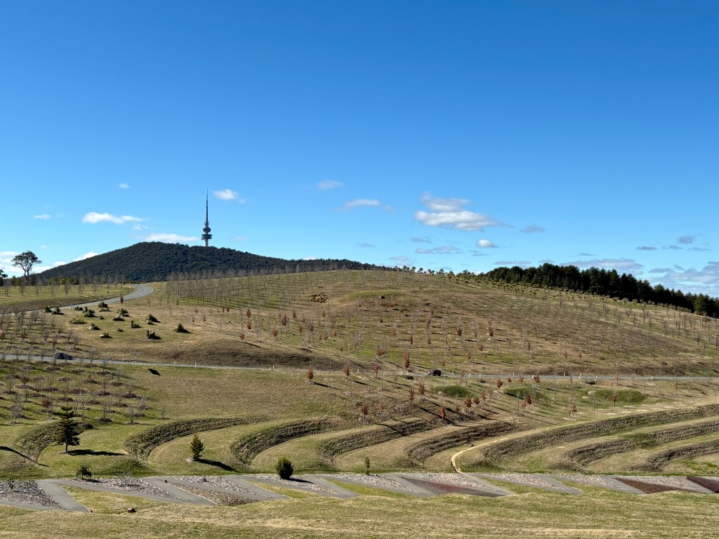 On the day I went for a wander, there were groups of school children enjoying the space and gardens, and a couple of artists were taking advantage of fine weather to capture the stunning views towards Canberra. One of the highlights was coming across sculptures in the arboretum, including Nest III, shown above. This was created by Richard Moffat in 2007, and is an Australian wedge-tailed eagle on its nest. The sculpture is made from welded steel found-objects, mainly abandoned farm machinery, and it sits atop Dairy Farmers Hill. The sculpture at the top of the page was created by Marcus Tatton and Chris Viney, and is based on three words from ‘My Country’. This is a well-known poem by Australian poet and fiction writer Dorothea Mackellar. It is in the form and style of Mackellar’s handwriting, and is visible from many parts of the arboretum: it is 35 metres long and 3 metres high. You can find more information about the Forest Sculpture Gallery here.