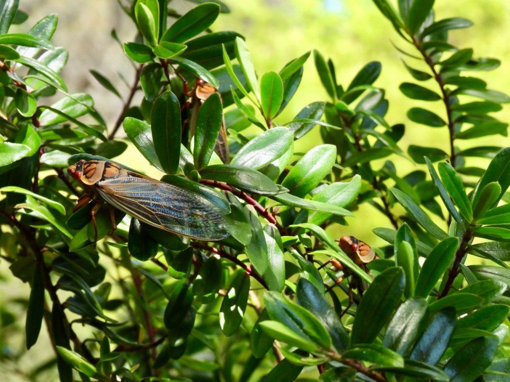 After being underground for seven years, the sheer volume of cicada numbers that emerge is an anti-predator defence. Almost all the population of periodical cicada species emerge in a synchronised manner, maturing into adults in the same year and within days of each other, with no cicadas in the years between. This deliberately overwhelms potential predators to ensure success in the breeding season, and is called ‘predator satiation’. Consumers of cicadas include birds, bats, spiders, wasps, tree crickets and ants. I’ve seen many birds flying off with a cicada in their beak over recent weeks.
