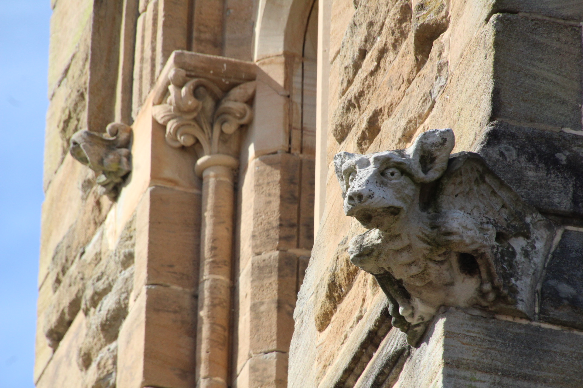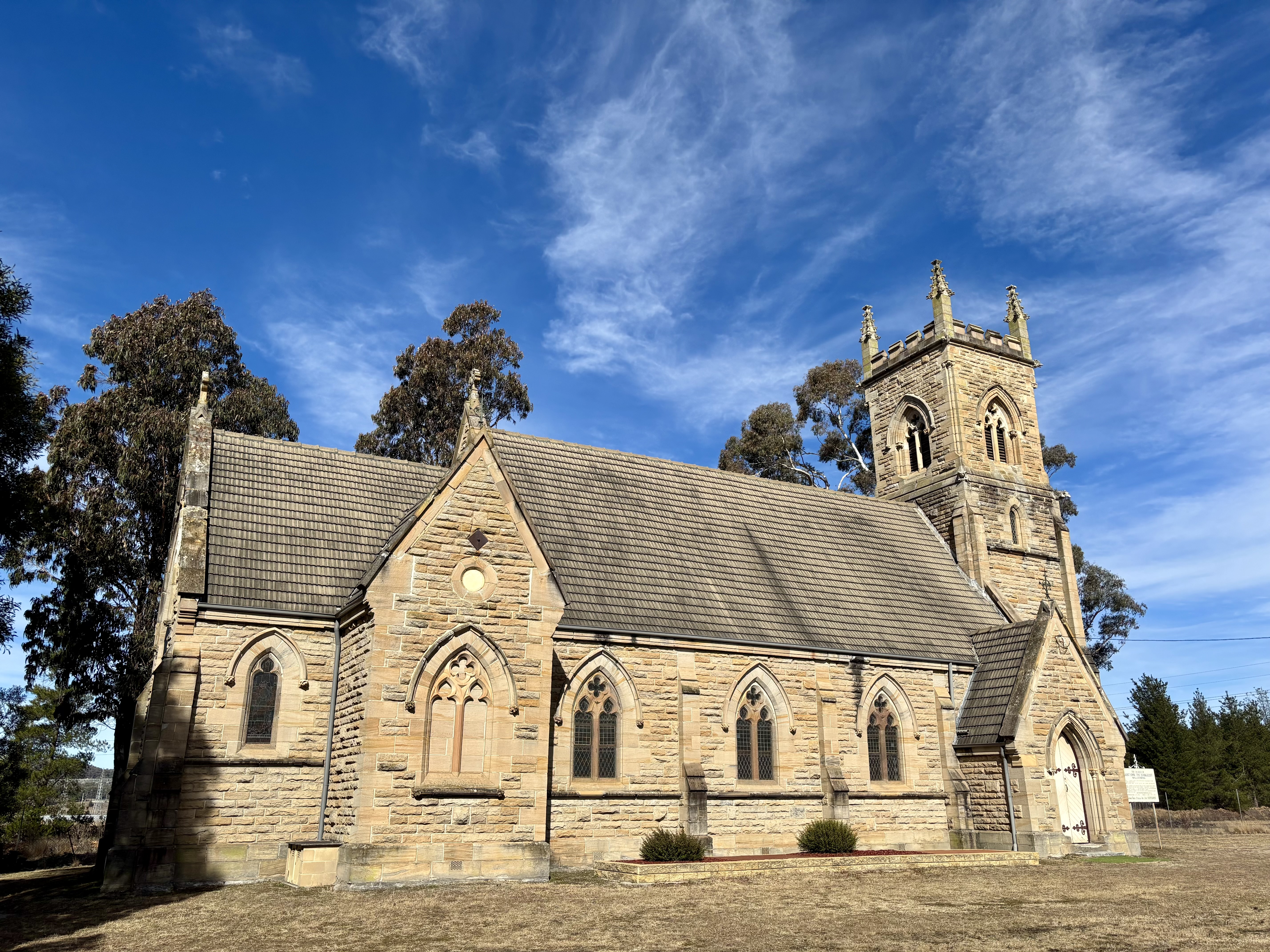 The Church of St John the Evangelist was built in 1881 on part of the original Wallerawang station to a design by Blacket & Son architects. It was built by Mrs Georgina Abbott, who was the daughter of James Walker. It was the estate chapel, and a public dual-denomination church. In 1952, it was formally given to the Presbyterian and Anglican churches. This Victorian Gothic style church is a rare example of a major church building erected by private philanthropy. The tower has some interesting animal face gargoyles, and the church has a beautiful sense of symmetry.