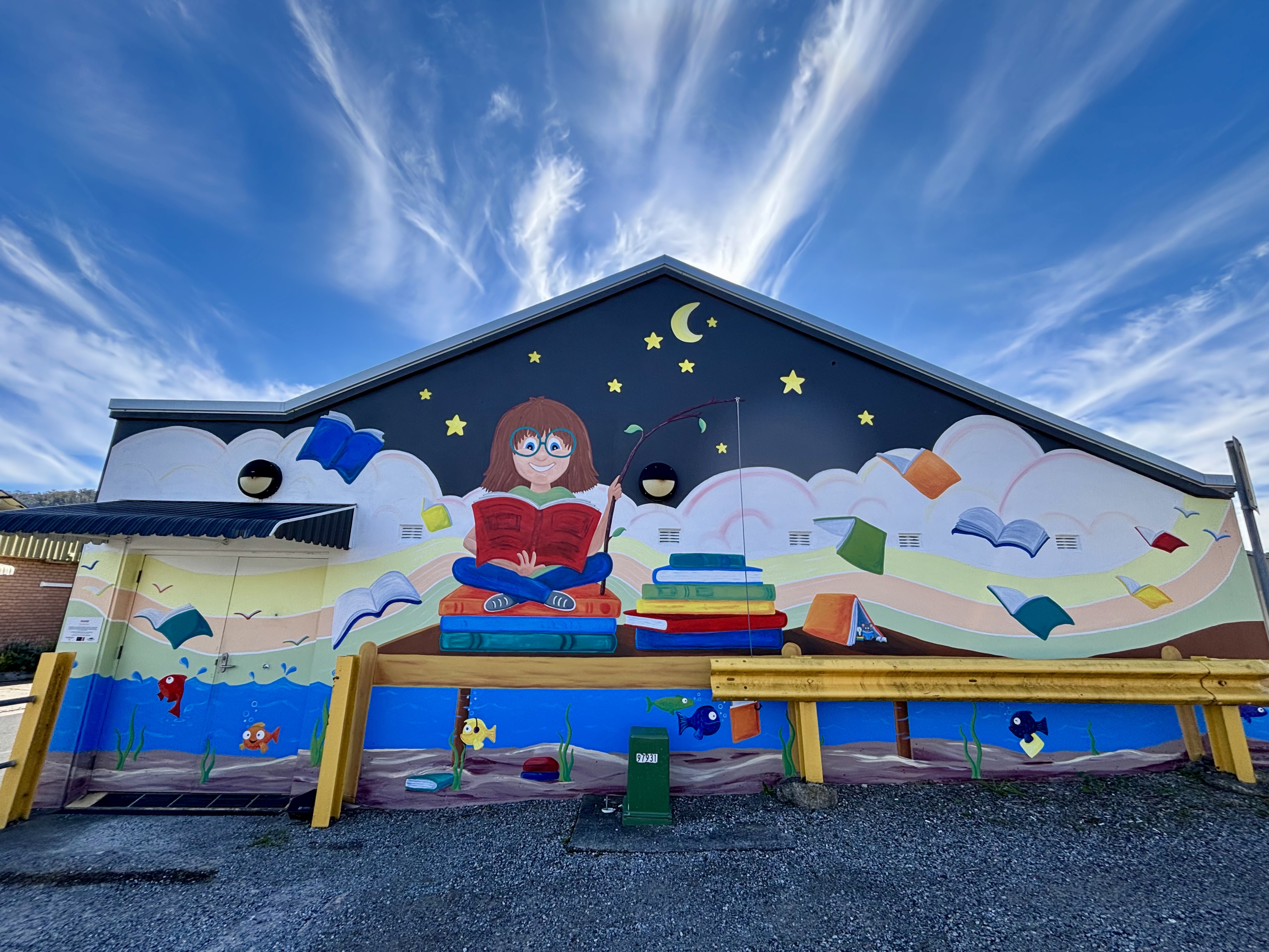 Created in 2023 by Elaine Butler, Share celebrates the joy of reading, and the journeys that books can offer. I love the bright, bold colours and the different ways that the fish are enjoying the fun of reading too. This mural is on the rear wall of the Lithgow Library.