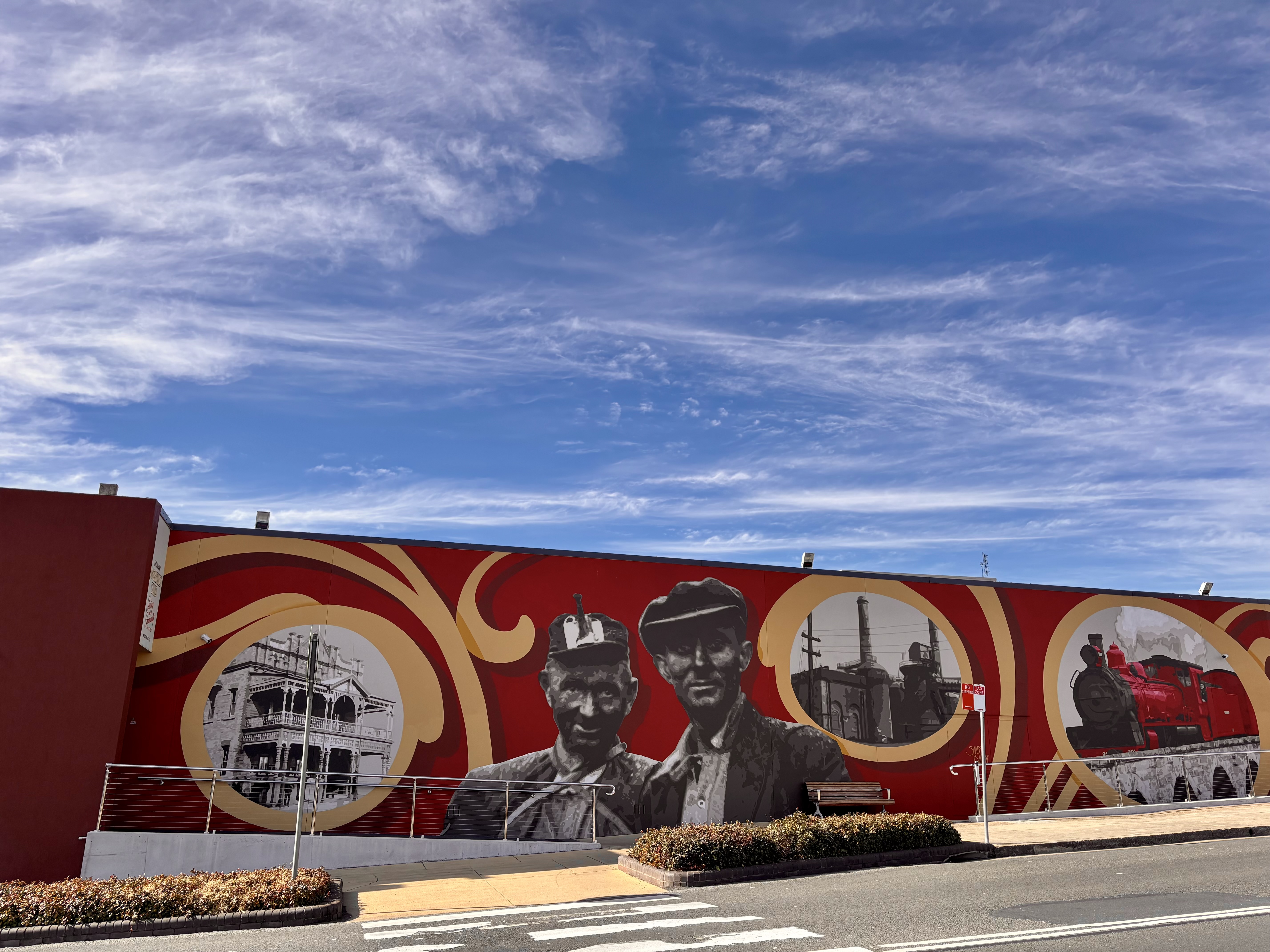 A recent addition to the growing collection of murals in Lithgow is the Lithgow Workies Community Mural, created by Sharon Billinge. It is located at the entrance to the Lithgow Workies Club, which is the oldest registered club in NSW. It dates back to 1887, and has over 10,000 members. This mural is a celebration of Lithgow’s past, with images of the heritage club building, a portrait of two coal miners, the steel works in 1902, and the Zig Zag crane.