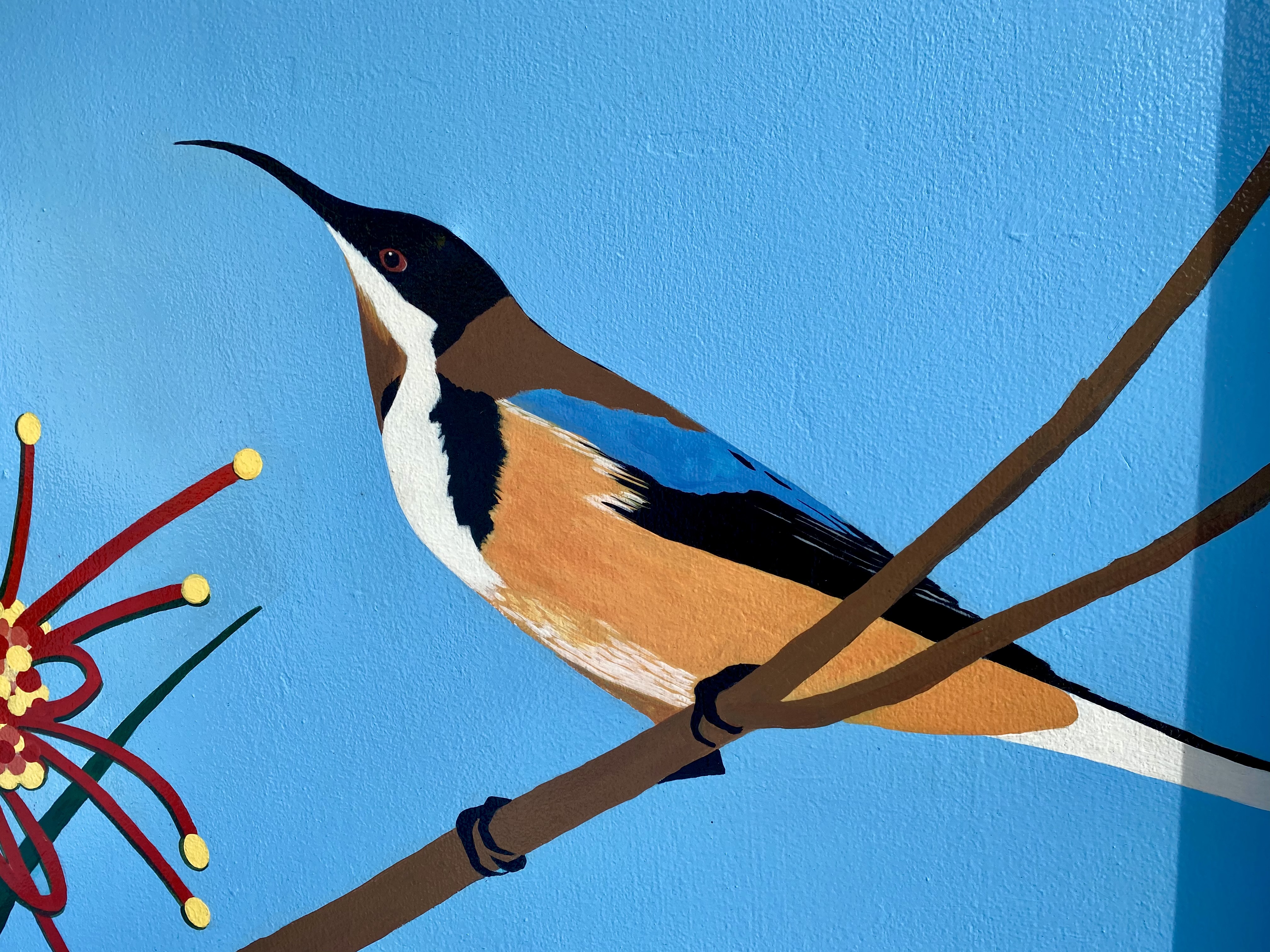 The Eastern Spinebill is a common and widespread breeding resident of the Blue Mountains, found in forest areas, woodlands, heath, and swamps. In the winter months, they tend to move to lower altitudes, though there can be an influx of them when banksias and other native plants are in flower. There are murals of this busy bird in the mountains, including the one shown above and another at Springwood.