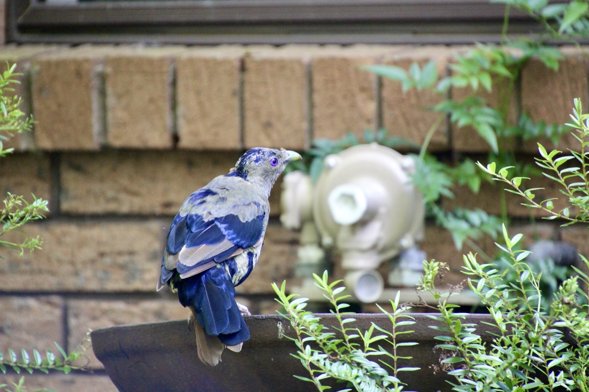 Satin bowerbirds are a regular and welcome visitor to my garden. Most of the birds are coloured grey-green, with olive-brown wings and a scalloped underbody. Their eyes are violet-coloured, and females and juvenile males look the same. Both male and female birds have feathers extending onto their relatively stout bills. By the age of seven years, males will develop their beautiful blue-black feathers, looking patchy during their transition to mature plumage.
